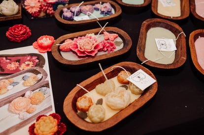 Scented dough bowl with elegant embellishments. Choose floral designs to whimsical holiday designs. Use as a beautiful centerpiece or burn for up to 30 hours. FYI bowls are fire retardant sprayed twice and silicone mat is layered between bowl and wicks.